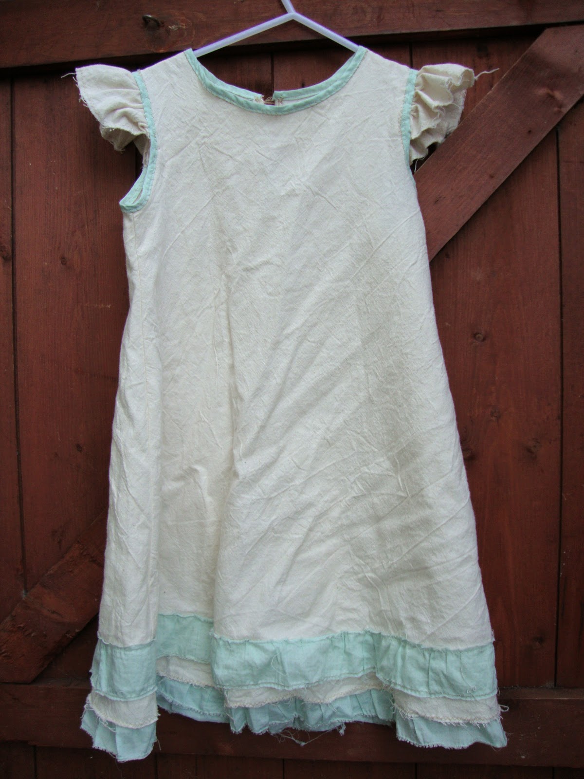 I've always got a few projects on the go. Last weekend I made my first garment from a real, honest-to-goodness pattern. This isn't something I've patched together from the windmills of my mind. Uh-uh. I've come to realise that no matter how much I think I can just 'figure out' how to make something by looking at something similar, it always takes three times as long and turns out half as good as I'd hoped it would. So I had a go at making the Dress with Ruffle Trim from the book Carefree Clothes for Girls, which has been raved about all over blogland (though it has received mixed reviews on Amazon). I found the pattern pretty well-written and easy to follow (though I have little pattern-following experience from which to judge). I used some super-inexpensive unbleached cotton calico for the dress (which I didn't line as per the pattern), and made bias trim and ruffles from some smooth-as-butter Paul Smith shirting cotton. I'm pretty happy with it, though I took in the size 6 at the sides for Eva, as it kind of swamped her. She is petite, so perhaps I should have made the size 5. Anyway, I'm pretty happy with it, considering my very low level of skill and the very low cost of the materials.